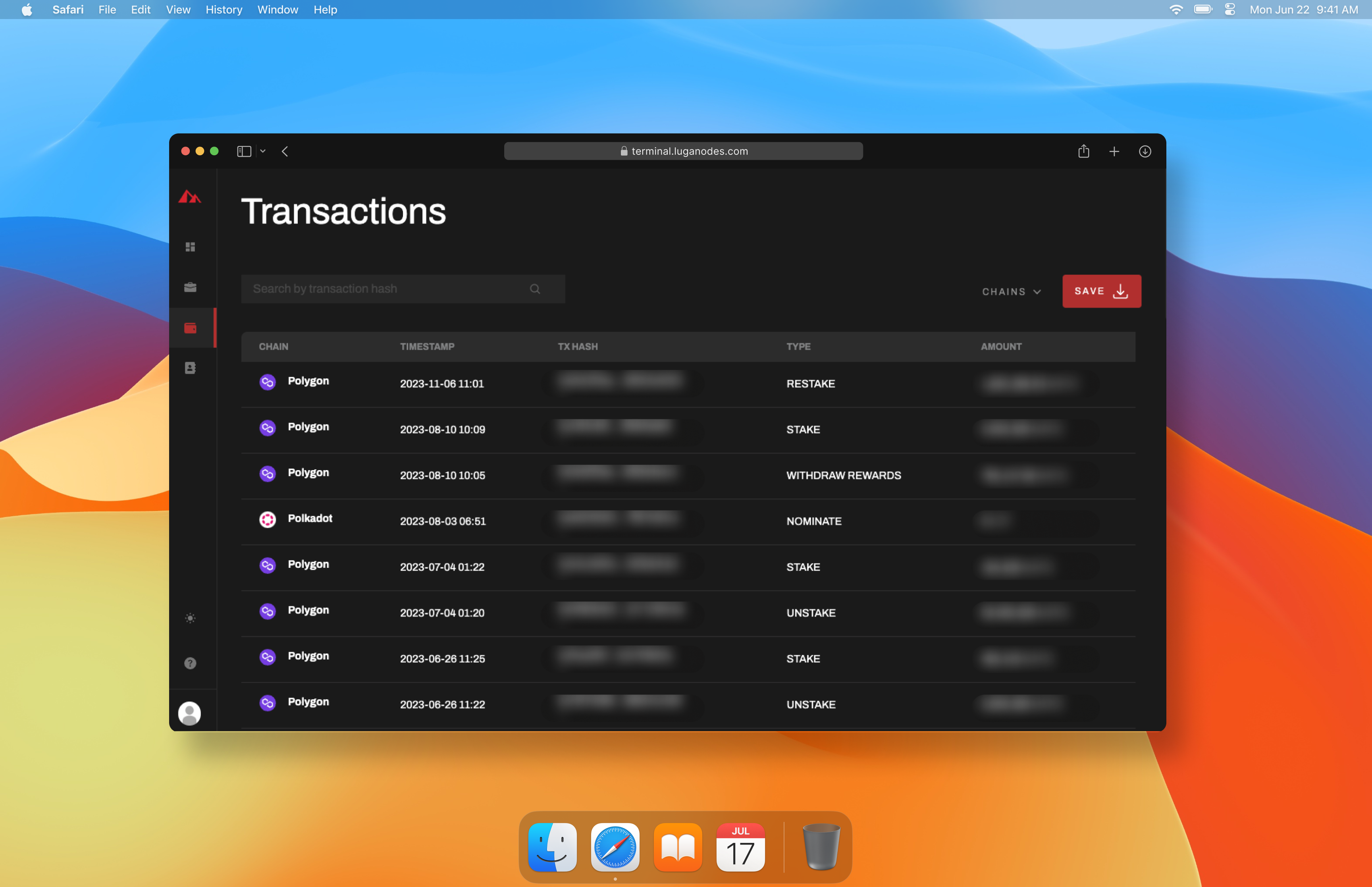Through the Terminal, users can monitor all staking-related transactions, including reward payouts. While these transactions may vary at a chain level, with some reward payouts not displayed as transactions. Additionally, users have the ability to download chain-specific transaction reports which cover all transactions from the day of stake.